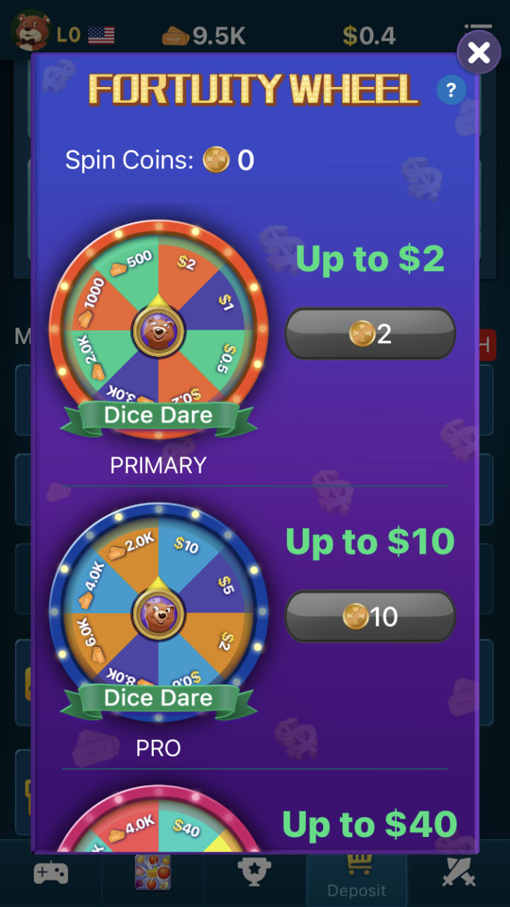 The Fortuity Wheel requires Spin Coins, which you can either purchase or earn through completing tasks. Once you have enough Spin Coins, you can spin the wheel and claim a prize. To up the ante, you can double your prize if you are feeling lucky by rolling dice and choosing high or low. The Fortuity Wheel will give out Tickets or cash prizes for use on the main games.