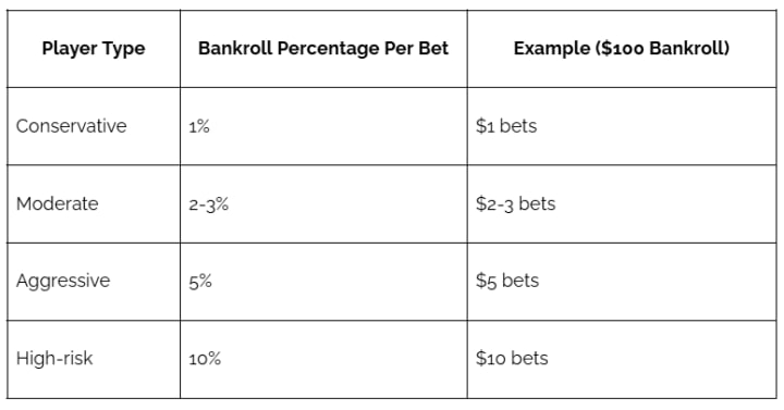 This strategy involves only risking a small percentage of your total bankroll on any single bet. Here's a simple guideline: