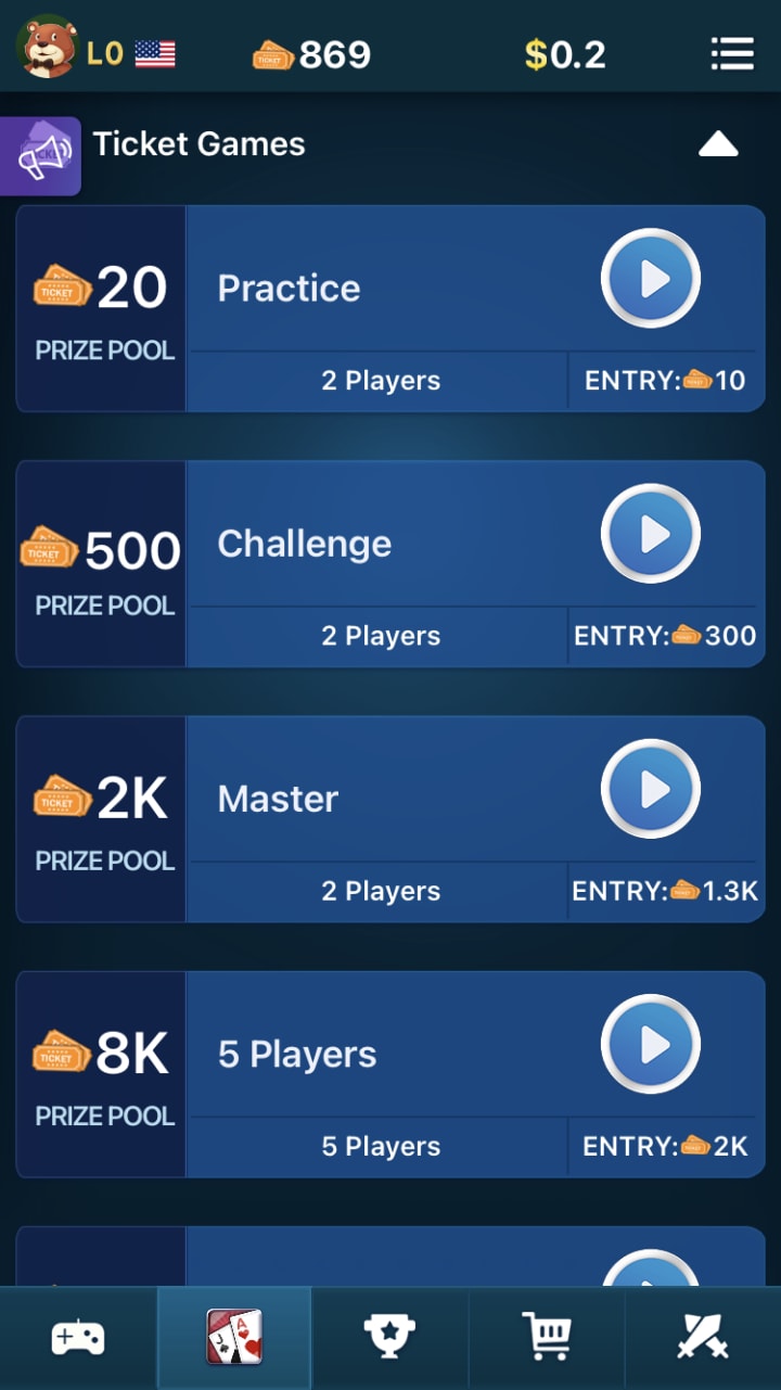 Speaking of the games, Pocket7Games offers several different games to play depending on what you enjoy. I personally went for their spinoff of Blackjack which I found pretty addicting. There are four columns that you can designate cards to and once that column hits a total of 21 it clears out and resets to 0. Do this until you clear out the deck of cards and whoever has the highest score wins the tickets or cash prize.