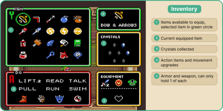 The Legend of Zelda: A Link to the Past was released for the Super NES in Japan in 1991. It is the third game in the Legend of Zelda series and is known for establishing many of the game's classic tropes, such as the Hookshot, the Master Sword, collecting pieces of heart, and the existence of two parallel worlds. While the game is a cult classic, the UI is basic, unintuitive, and does not hold up to today's standards.