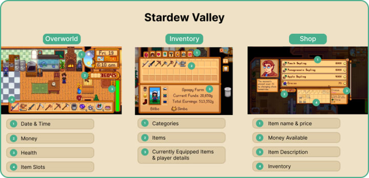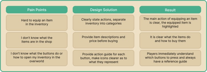 I analyzed and broke down all features and UI for 3 frequently used screens - the inventory, the shop, and the overworld, or your main view when you are playing. Many icons are unclear, the buttons to complete an action are not stated, and the inventory could use organization.