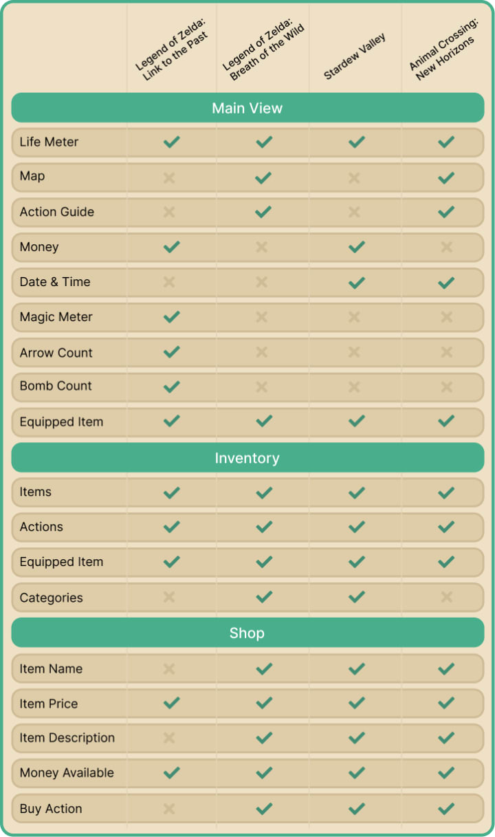 I looked at the same 3 screens with 3 games that have notably good UI and inventory management - The Legend of Zelda: Breath of the Wild, Animal Crossing: New Horizons, and Stardew Valley. I analyzed how they tackled each feature and what they chose to display. Then I compiled all the features across all the games and organized them into a feature matrix.