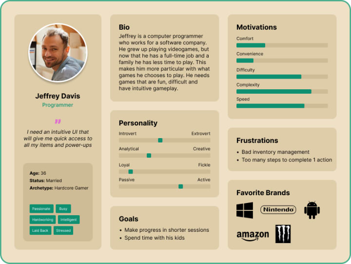 I created two personas to understand users' motivations. One persona is for an experienced gamer who needs easy access to everything, and an inexperienced gamer who needs clear instructions on what to do. I also made a POV statement, which is my purpose of redesign, and put together a feature matrix of all planned faetures on each screen.