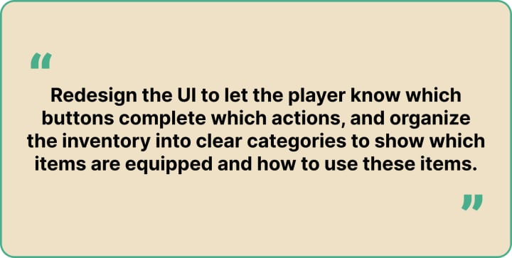 4. "There should be maybe a sound or a frame around which item is equipped. I didn't know what was equipped otherwise.."
