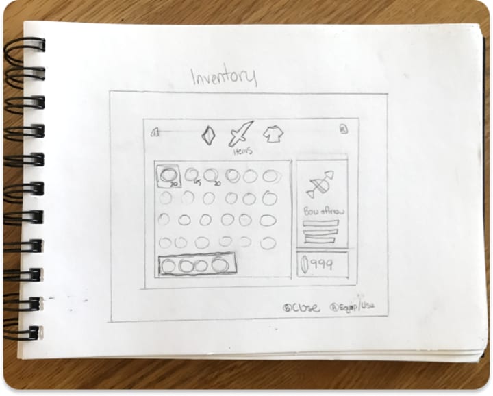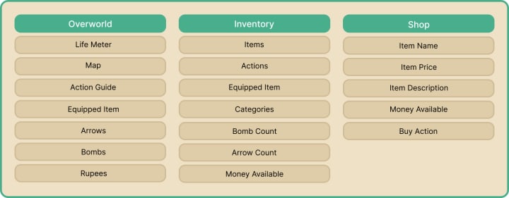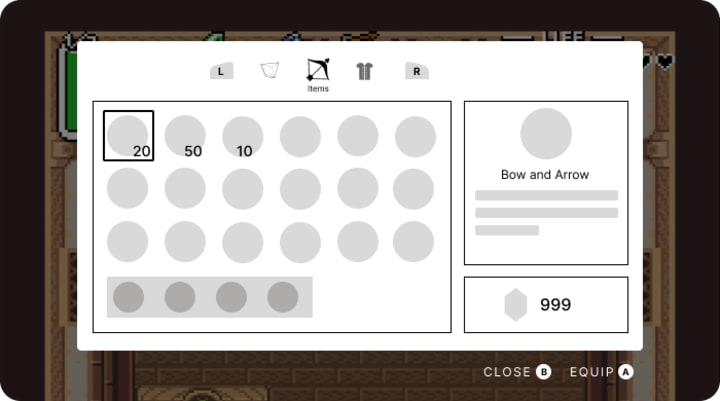 I was finally ready for the final UI. I chose a neutral color palette with the highlight color a sage green, to match link's tunic. I added categories to the inventory, to make it more organized, and made sure the actions were clearly labeled so even the most novice player could understand.