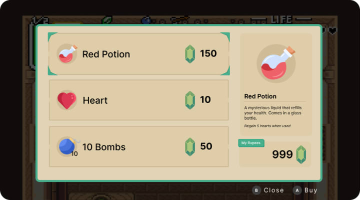 5. "The shop was easy enough to understand, the prices are there next to the items, but when I select an item it doesn't tell me what it is. I bought a medicine without knowing what it is. I wish they would ask if I wanted it first without just buying it."