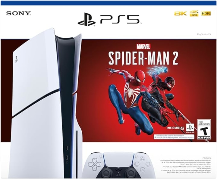 The Marvel's Spider-Man 2 Bundle for the PlayStation 5 Console (slim) is an exciting combination of legendary superhero storytelling with state-of-the-art gaming technology. This bundle, which is a version of Sony's much-coveted PlayStation 5, comes with special content related to the adored Marvel Spider-Man property in addition to the ordinary PS5's robust hardware and capabilities.
