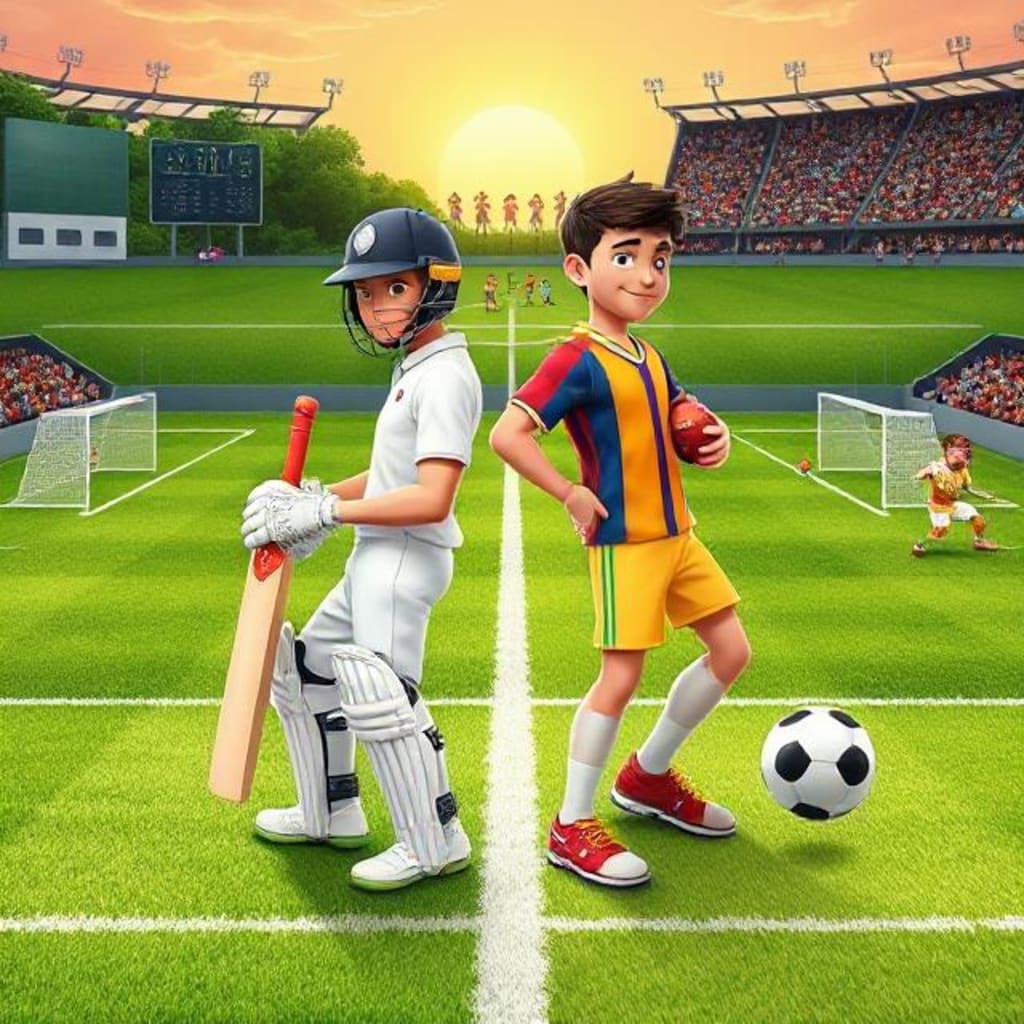 Two fields sat side by side: one was a proud cricket pitch, polished and primed, with white chalk lines and tall stumps guarding its center. The other was a bustling soccer ground, alive with echoing cheers, goalposts, and a well-worn ball that had been kicked more times than anyone could count.