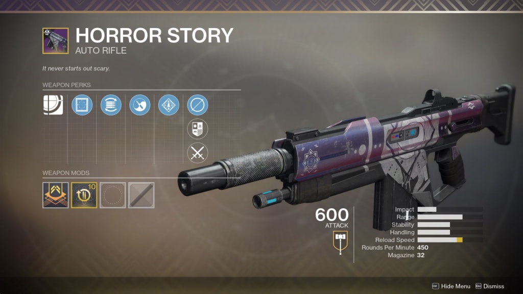 First of all, the Horror Story was the first limited item drop from the Festival of the Lost that had non-cosmetic impact on the rest of the game. Furthermore, it was a beast of a drop at a guaranteed six hundred-power level. So even if you swore off auto rifles all together, you improved the rest of your loot and engram gains just by carrying the darn thing around. Finally, it boasted a curated roll with both rampage and Zen moment. It was, in every way that it could have been, a well-constructed auto rifle.