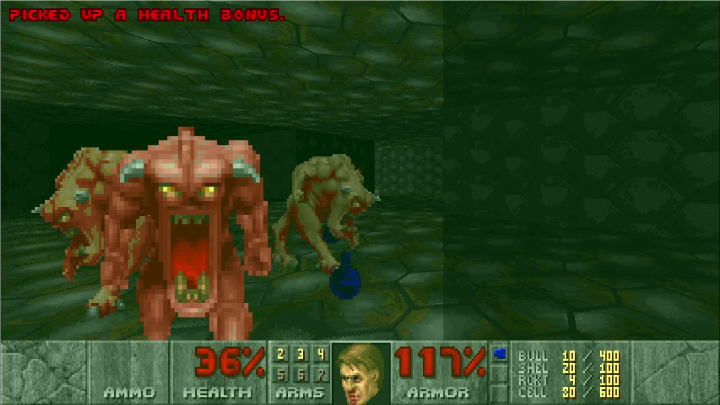 For those who may be wondering, no the super shotgun (double barrel) doesn't appear in this game, it's in Doom 2. But the regular shotgun in this is still powerful and I found myself using it more than any other weapon. Partly because I liked using it and there was a lot of ammo for it. Plus it's a shotgun and you do feel like a badass. The chaingun obviously uses a lot of ammo and doesn't pack much punch but it's still fun to use. The rocket launcher was hardly fired or the BFG 9000. It did get more use when I almost died when a load of Pinkies and Imps filled the room. The Spider-Mastermind is when the BFG 9000 saw the most use. As for the plasma gun that was a beast. A monster of a weapon that eats power cells like the chaingun chews through bullets only this took far fewer shots to kill something. Plus you feel unstoppable wielding this even when a room full of demons appear as the walls drop. If you need to clear out a room, I highly recommend using the plasma gun or BFG, the rocket launcher is the last resort for myself because if you're too close to the target watch your health drop.