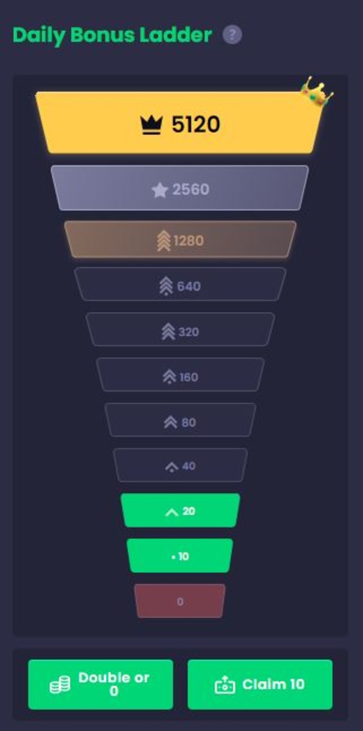 Once you start earning you get access to the Daily Ladder. Depending on your level on the site you can simply claim 10 or 100 coins, or you can keep going for double-or-nothing to earn 5120 or 51200 coins. This means that potentially you can earn $5 a day as a level 1 user or $51 a day as a max-level user!