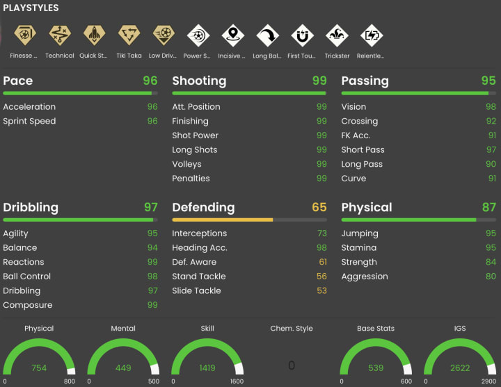 - Dribbling (97): His best attribute. Close control, balance, and agility allow him to easily overcome defenders. His Technical Dribble style makes him very fun to use.