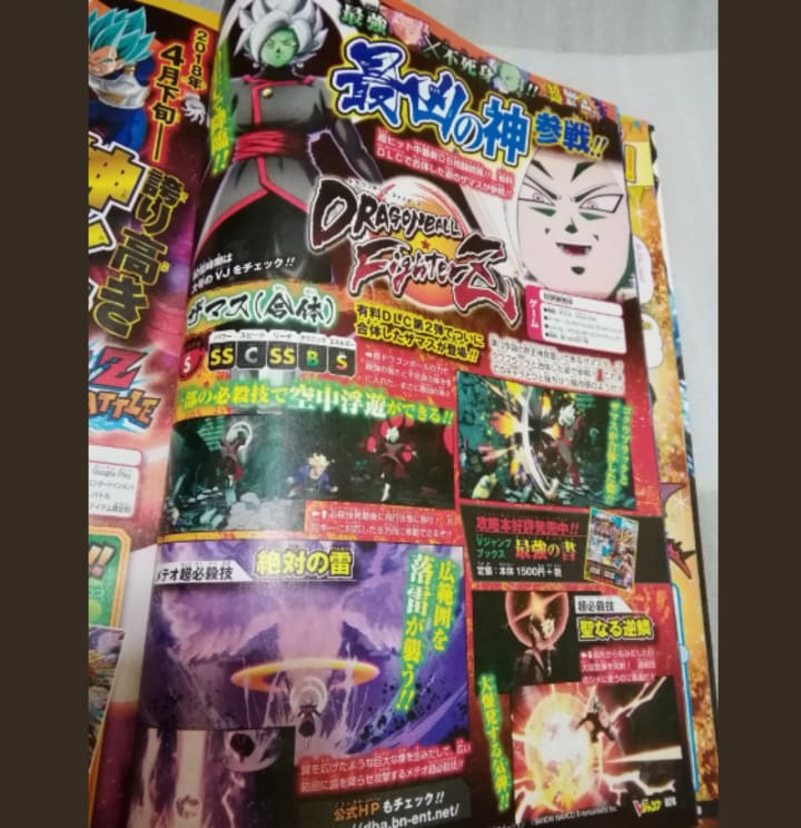 Shoutout to Veru on Twitter for posting this from the V-Jump scan. Now obviously, this magazine does not show Vegito Blue, which is going to be the character paired up in the DLC pack with Zamasu. As you can see here, these are all screenshots of Zamasu's finishing moves. Now for those that still did not believe the DLC character were getting and based on the scans, after Fused Zamasu appears, Vegito Blue will come after him. Then it will be "base form" Goku, "base form" Vegeta, Android 17 "Protroller," and Cooler "Final Form".