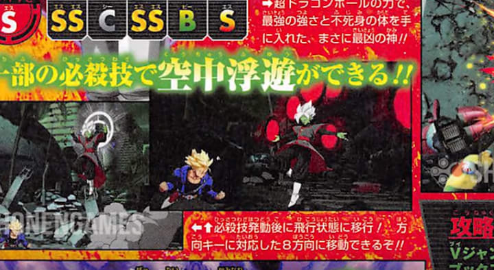Zamasu looks invincible in this shot here against Future Trunks (Super Saiyan). Based on the scans here, there will be a cinematic finishing move of Trunks beating Zamasu, which I cannot wait to see and it will be really cool. There are stats above both fighters (SS, C, SS, B, S) that displays if a fighter performs well.