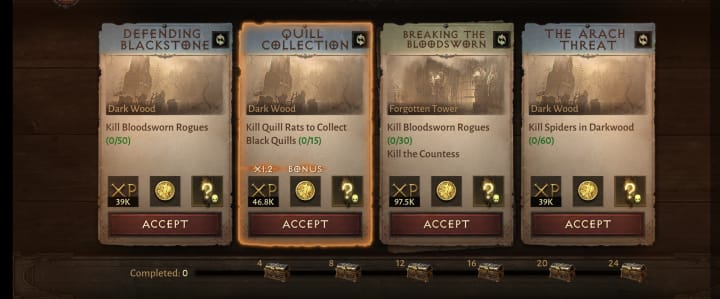 Every day you will have the option to complete daily bounties in Diablo Immortal. You get 2 sets of 4 bounties which will take you to a specific map within the game. Each set of 4 bounties will need to be completed in these areas.