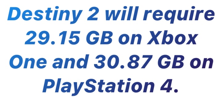 #Destiny2 is going to launch at a moderately hefty size of 29.15 GB on Xbox One and a solid 30.87 GB on PlayStation 4. It's safe to assume that the PlayStation 4 Pro version is slightly bigger due to the games PlayStation 4 Pro support. There has been no released information about the games install size when the Xbox One X launches in November. It may even increase the install size of the Xbox One version to above 30GB this fall. So do take that bit of news into consideration as well for those of you looking at 4K support on the newer console.