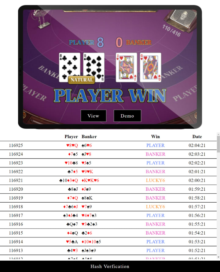 First of all, for provable fairness, RNG generates the list of hashes. Each element in the list is the hash of the previous hash. The first hash is generated by uuid4. Then the list is reversed so that it provides the consecutively verifiable hash list, i.e. hashing the current hash outputs of the previous game’s hash. This reversed hash list is uncheatable and easily verifiable because no one can predict the next hash in the reversed hash list in the reasonable time and anyone can verify the current hash is valid by hashing the current hash.