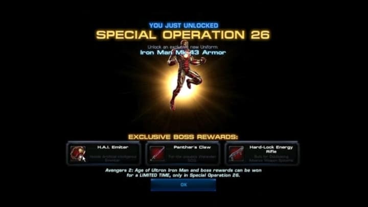 The game itself was a unique one. Its sophisticated plot was launched to coincide with Marvel Studios's release of The Avengers, and Avengers Alliance always tried to tie in with the films. You'd regularly see new costumes, new character releases, and limited-edition 'Special Ops' that were loosely inspired by the films' plots. At the same time, though, the game always tended to respond to changes in the comics; when the Season 2 campaign was launched in June 2013, it took inspiration from ongoing arcs in Jonathan Hickman's Avengers and New Avengers. Special Ops were often related to Marvel's annual 'summer event, perhaps the most notable being the Avengers Versus X-Men tie-in, which gave you the option of playing the same narrative stream from the perspective of two rival superhero teams.