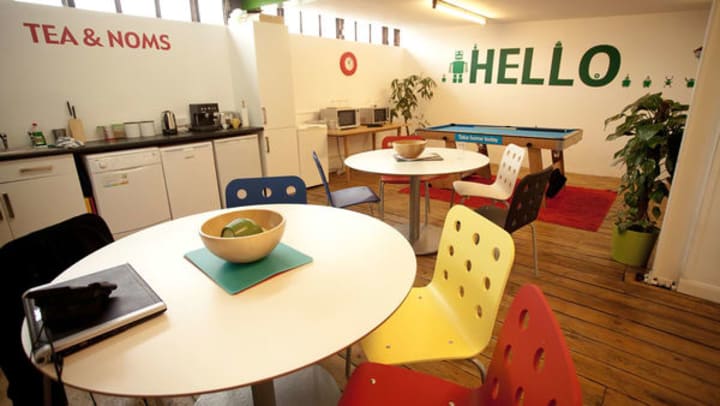Based Guildford, UK, the office looks like what I imagine every small start up office might look like. Cool looking chairs, a place to play and unwind, and a lot of creative inspiration plastered all over the walls.