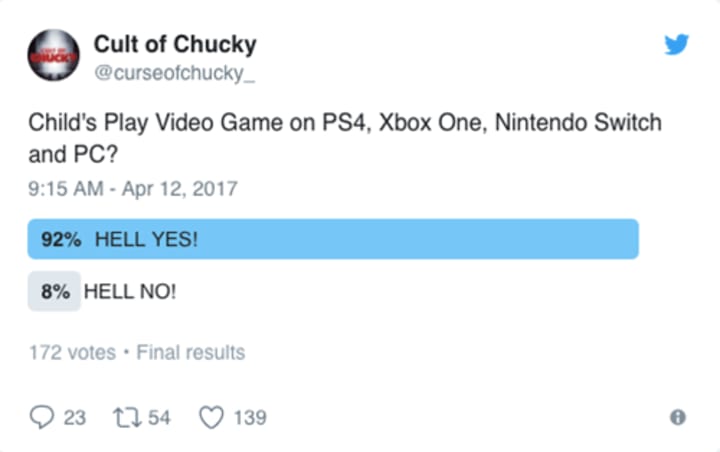 Excitedly, we don't know what a Chucky game could involve, but is sure to be frightfully violent. Will we get some Five Nights at Freddy's jump scare, or will it be a spooky Alien: Isolation survival horror? It all sounds like our wildest nightmares come true, but we have only one question: who the Chuck are the 8 percent of people who voted no to this Chucking amazing idea?