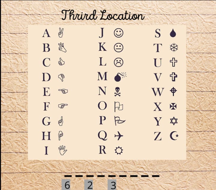 Now the only location in the area that comes to mind with the word creativity is this new business leader called Creativity Unleashed. They helped businesses rebuild, reframe innovation and be creative and leverage for success. This place was a few blocks north. Not far. Well, how is this location going to help me? Are there more clues in the notebook? I thumbed through some more pages. A few pages near the back I came across “third location” and a cypher that followed and then 9 lines _ _ _ _ _ _ _ _ _ with 3 numbers in grey under 4 lines. 6 under the first line, 2 under the third line and 3 under the fifth.