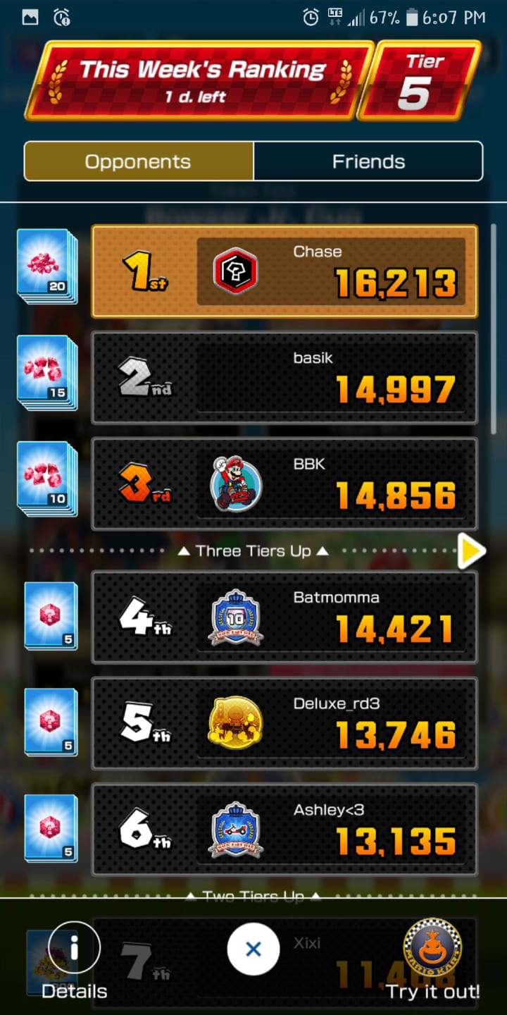 Each week, a specific cup is chosen for everyone to compete for the highest score. Some of the competition gets pretty steep. Tier one was fairly easy, as you might suspect, but securing that first place position allowed me move up three more tiers. I had much more trouble in tier four and only got tenth place, but it was enough to get me to tier five. So far, I’m in first place with only one day left. You can also compare your results to those on your friends list. Winning gets you rubies, gold, and tickets depending on where you rank.