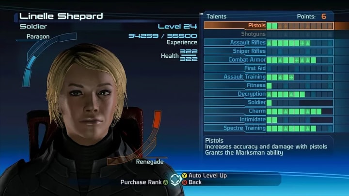 The next thing the player will learn about will be talents, which are the skills or abilities. Each class has 12 talents, which are broken down as four starting talents and eight unlockable talents. These will depend on the class the player chose, but there are 21 in total, which are broken down into six categories; combat, weapons, armor, tech, biotic, and health.