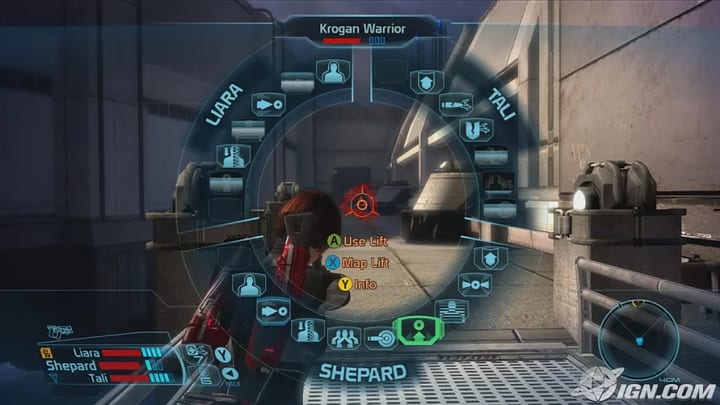 Something else the game teaches the players is how Shepard is able crouch or stand behind objects to take cover from enemy fire. This is good for different reasons. (1) The player can get out to the line of fire and can shoot around the corner at the enemies. (2) The player’s weapons can cool down, with it shown above the player’s health. When Shepard gets hit there are blue bars that will be eliminated first. This indicates the player’s shield. After the shields are gone then the red health bar will begin to diminish. The player can heal themselves and their teammates throughout the game.