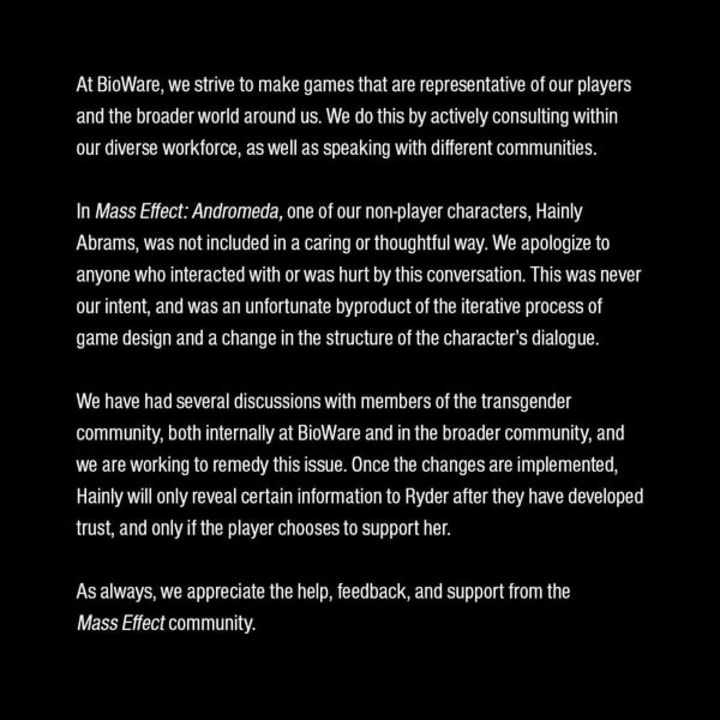 From #Bioware's official statement on Hainley Abrams: