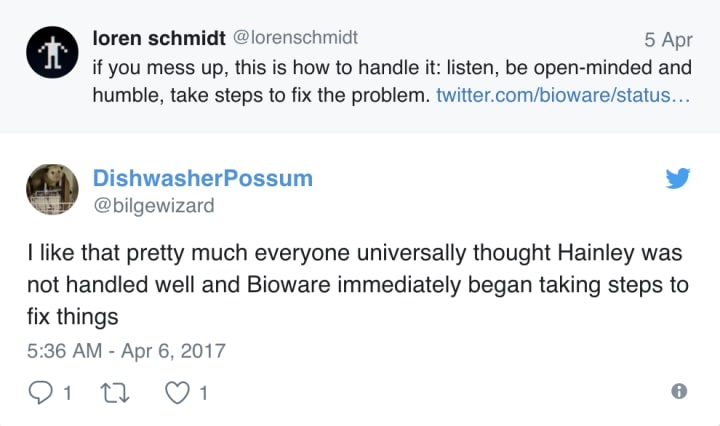 Whatever the case may be, for a major game studio to listen to and address fan concerns in a storyline context, particularly involving LGBT characters, is hugely significant. In today's political and social climate, BioWare's receptiveness and inclusivity is refreshing and all too rare.