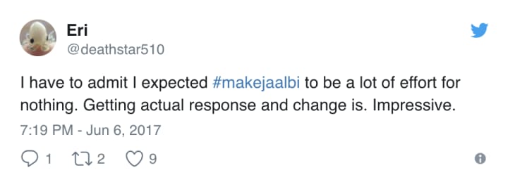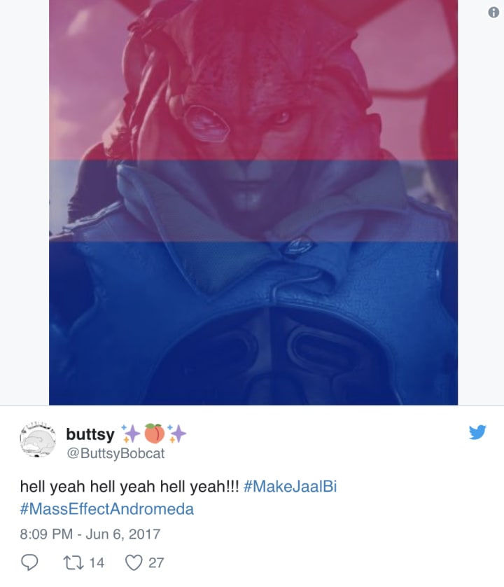 After the discovery that Jaal was originally intended as a bisexual love interest but released for Sara only, BioWare's #LGBT fandom lost little time in organizing on social media, asking for what was originally promised. The hashtag #MakeJaalBi was created to bring awareness to the cause, citing a history of cut or sidelined bisexual romances in all Mass Effect games, particularly for male characters, and emphasizing the importance of inclusive representation, something that has long set BioWare apart from its gaming peers.