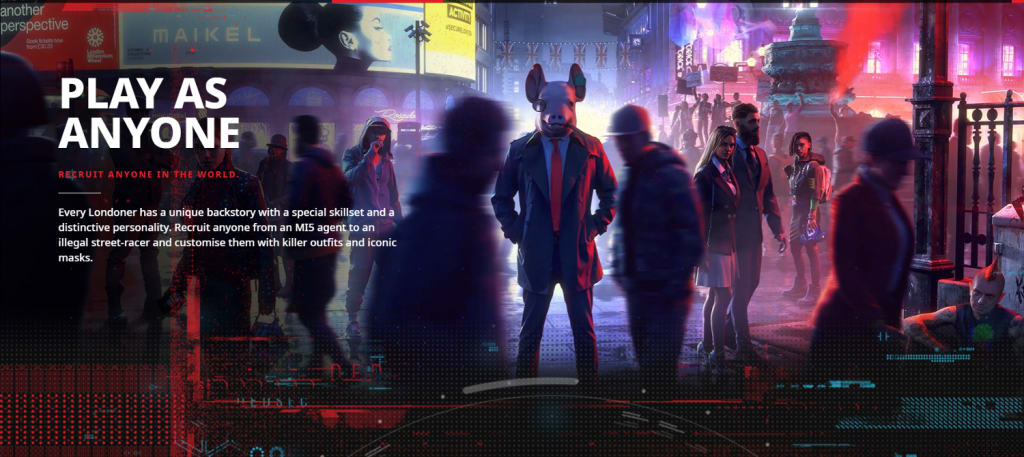 Watch Dogs legion is the third entry in the Watch Dogs franchise. Every game tried something new. The first Watch Dogs being an open-world crime game with a morality system and hacking, watch Dogs 2 expanding on the hacking aspect and lowering the health of the main character and restricting the character's loadout to 2 guns and a non-lethal taser to make strategised stealth a better option. Also for the first time in any watch Dogs game, they added Dogs. Legion Has the unique gimmick of there being no main playable character but instead, any NPC in the game including enemies can be recruited into dedsec and then being playable and when those characters die, they are forever dead and can't be added to your team again. The characters you recruit are even fully animated in story cutscenes and all have unique voices. In the trailers NPC's were portrayed to be unique and change the way you play, some being spies, others being boxers or ralliers who can get citizens to beat up the police for you.