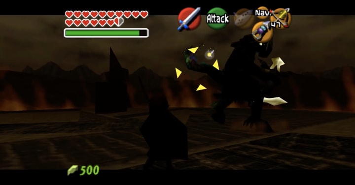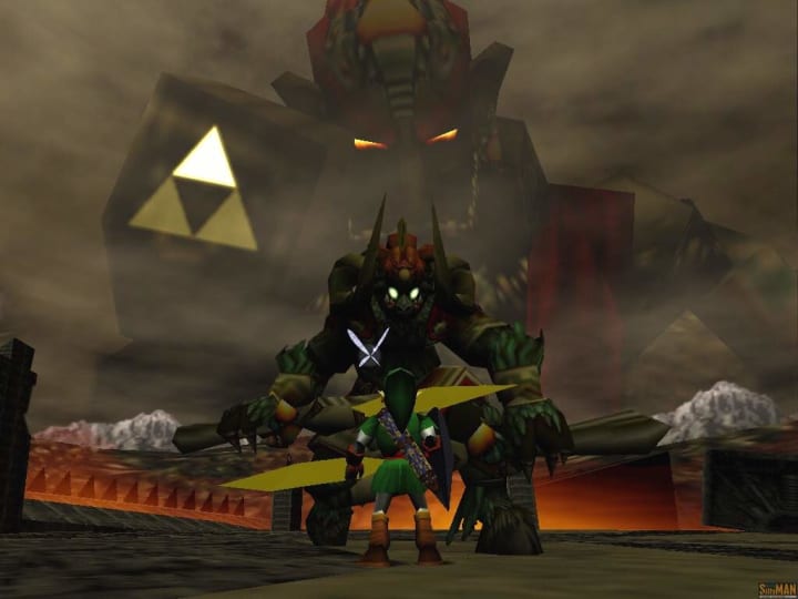 The final act of Ocarina of Time gave the player many twists and turns which made for an action packed climax. From not being able to use Z-Targeting in the final fight against Ganondorf to the King of Evil trying to collapse his castle after you best him, its a battle that takes a while to fully complete. However, most players thought it was over after the tower fell on top of Ganondorf, surely crushing his body beyond all repair. However, a sound emanating from the rubble puts both Link and Zelda on guard. Naturally, you go over to investigate, only to watch in shock and awe as Ganondrof emerges, floating in midair, showing you that he too, is blessed with the power from the gods. He begins to transform into a hideous beast as you're enclosed in a ring of fire, and soon you come to face to face with a creature that, to be quite frank, looks like it was pulled straight from a nightmare.