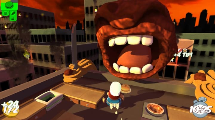 From there, you go through a series of levels to help get you ready for the final level: a giant mash-up of everything you've learned so far. The objective? To finally fill the Ever Peckish's stomach. On this journey you will learn many recipes such as hamburgers, salads, burritos, pizzas, and more! The faster you serve food, the higher the tip! Thanks to this, it's important to stay light on your feet. Speaking of feet, there's a dash button (and a button that allows you to speak your mind in a fairly rude way)!