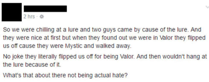 People having brewing resentment over something as silly as what team you're on in Pokémon GO seems pretty ridiculous. It's a game and it's meant to be fun, but somehow it's warped into something else in such a short amount of time. Being proud of your team and repping hard is one thing. Rep with all your heart, but when it encroaches on someone else's enjoyment and actually makes someone feel left out or even scared then maybe you need to take a step back and breathe for a minute.
