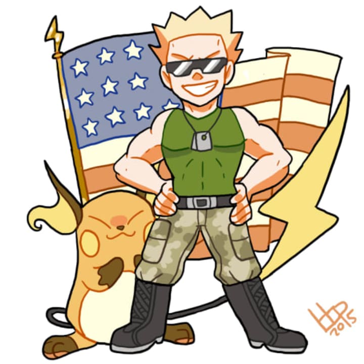 In Pokémon Red & Blue as well as the remakes Fire Red & Leaf Green Lt. Surge is described as the "Lightning American" and fought in an unknown war in the past.