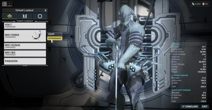 I was a bit offset by the fact there didn't seem to be much customization at the beginning. You have three Warframes to choose from and no kind of customization ability other than choosing your weapons. Once making it through the prolog, I learned you can customize damn near everything! There are warframe skins to collect that change your whole look or you can just play around with different color combinations to give your warframe its own unique look. The same can be done for all of your weapons and accessories. I've learned. Never judge a game on its prolog.