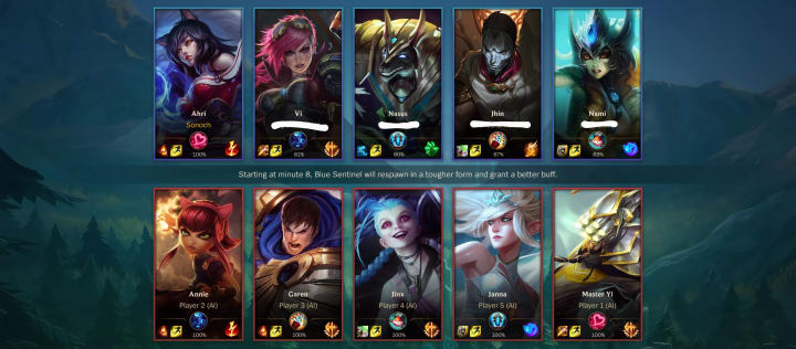 We were put into a few tutorials, basic how-our-game-works stuff implemented by Riot. I yoinked Ahri and jumped into an intro bots game.
