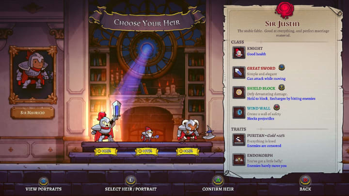In Rogue Legacy 2, you play as the Heir, an adventurer who follows in the footsteps of their ancestors (past Heirs who, tragically, died) as you explore a massive castle and the surrounding areas in a land plagued by dark and mysterious happenings. Along the way, the Heir upgrades the family estate with skills that benefit all of their descendants, collects gear that passes on to their descendants, and interacts with characters who always seem to recognize you, despite this being your first time coming here.