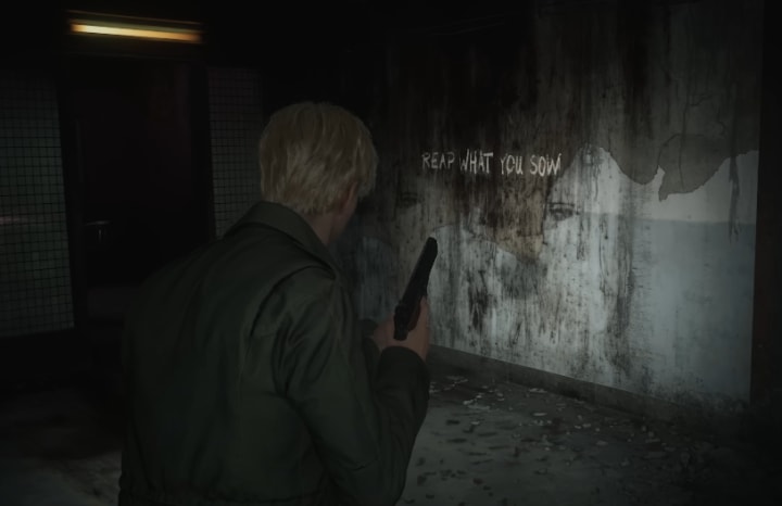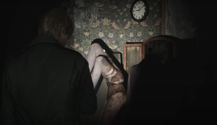 The trailer starts off with James presumably in the apartment level where the dead body is lying in a chair in front of the TV. We get screenshots of several iconic elements. It seems like most of the trailer's footage is from the apartments and hospital, lending credence to the "still-in-development" theory. We see the puzzles are still in the game, like the coin puzzle, the disgusting toilet wallet safe puzzle (which is a baffling description out of context), and James throwing some trash down a chute. We see a body stuffed into a fridge, no longer just a pair of legs sticking out.