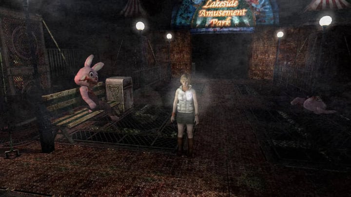 Heather's in Lakeside Amusement Park, a place usually associated with recreation, childhood, and entertainment. But this park doesn't look right. The ground has been replaced with rusty iron grates and there are rabbit mascot costumes with bloody mouths. Heather questions whether there's a person in the costume. Iron cages hold bloody...bags? People? There's a pervasive fog in the air and, to the player, a sub-bass drone that seems to press into your ears.