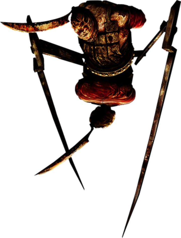 If you're hearing a cacophonous grinding noise upon entering an area, you are hearing the Pendulums. Pendula? To be honest, I still don't know what exactly these are other than two fleshy heads with protruding knives. They float in the air and will only attack on their mechanical blade legs if you engage combat, which I do not recommend. They are ridiculously fast, have tiny hitboxes, and cause a lot of damage. Interestingly, if you do manage to beat one down, they'll start making bizarre animal-like sounds. Their heads constantly flip up and down like each is trying to dominate the other.
