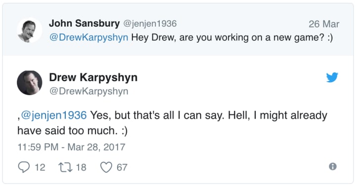 Drew Karpyshyn was the writer of the Knights of the Old Republic games (he went on to write a series of novels set in a similar era). He's apparently working on a new game — and he's currently unable to reveal what it is.