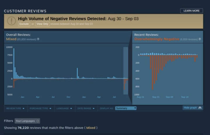 For those unaware, the topic at hand is something known as review bombing. This is an event that happens when Steam users band together and drive a game's review score down.