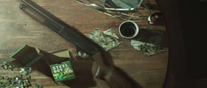 After you make your way through the garage fight, you'll find a shotgun in the main room. If you pick it up, you're locked in the room, but you can get it before the big boss fight (and you'll want to). First you'll need to find the scorpion key, it's in the processing area in the basement. You'll take that to Grandma's room on the second floor, and there will be a broken shotgun that you can exchange for a working one.
