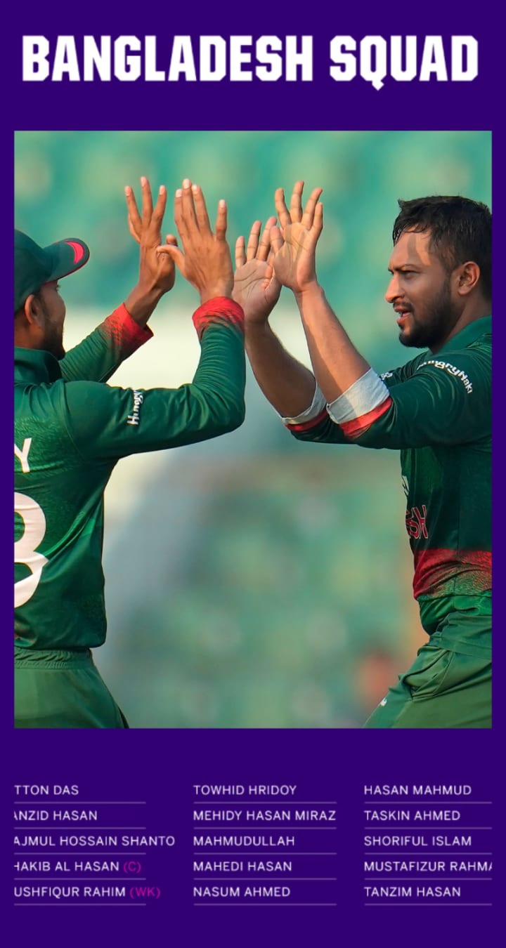 World Cup Squad: Shakib Al Hasan (capt), Mushfiqur Rahim, Litton Das, Najmul Hossain Shanto (vice-capt), Towhid Hridoy, Mehidy Hasan Miraz, Taskin Ahmed, Mustafizur Rahman, Hasan Mahmud, Shoriful Islam, Nasum Ahmed, Mahedi Hasan, Tanzid Hasan, Tanzim Hasan, Mahmudullah