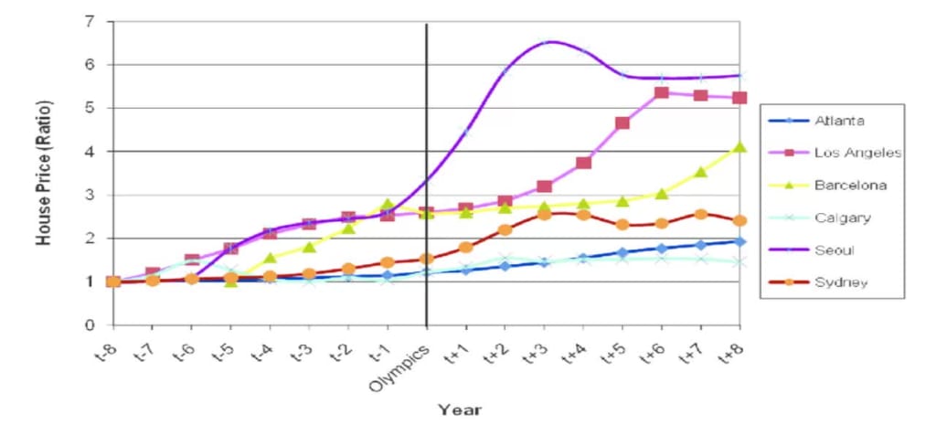 The effect of the Olympics on property values in host cities is complex and multifaceted. While short-term increases in property values are common due to the influx of investment and the creation of new infrastructure, the long-term effects are less predictable. In some cases, property values continue to rise, particularly when the games lead to lasting urban regeneration and infrastructure improvements. However, in other cities, Olympic-related developments have resulted in abandoned venues, rising inequality due to gentrification, and long-term declines in property values.