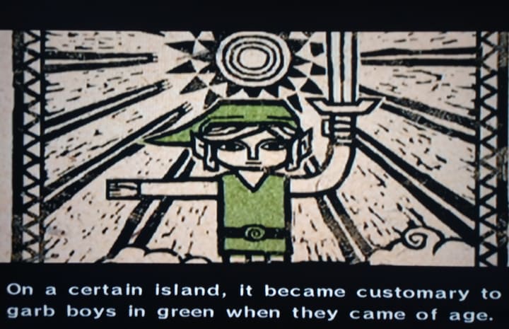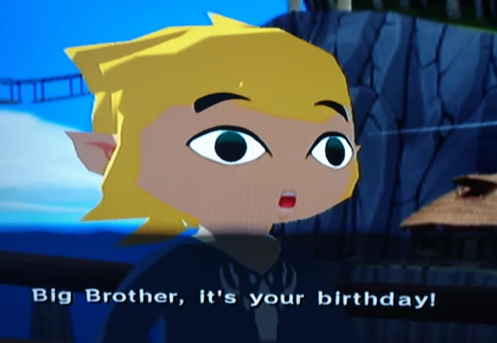 Well, since the hero of time didn’t appear, Ganondorf grew powerful enough to wreak havoc upon Hyrule, so what do the people do in reply? They sink the whole fucking world, and Hyrule vanishes like memories of the dearly departed, yet, somehow, there are legends of a hero in green, and so, on outset island, when a boy reaches a certain age, he ceremonially dresses in green garb, and on this fateful day, when our nameless hero to be, Toon Link, comes of age, he runs around his hometown only to witness the kidnapping of his little sister, and the game is off!