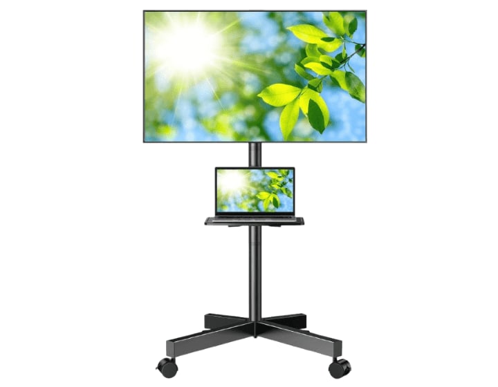 Highly mobile with lockable wheels | Tilt adjustment for better viewing | Extra shelf for devices or laptops | Sturdy build supports larger TVs | Easy to assemble and move