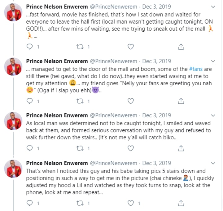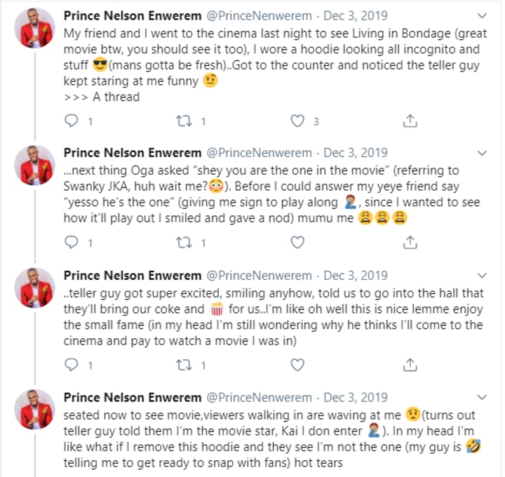 And it’s a very hilarious story. Prince shared about how one time, a cinema staff confused him for Living in Bondage actor, Swanky JKA as well as the drama that followed that afterwards. The tweets read: